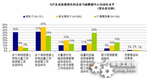 於是,在這一係列的影響麵前,IT客戶們希望通過部署這些工具來達到節省IT時間和成本、改善服務一致性的目的。而在對企業IT管理最佳實踐(如ITIL)的(de)利(li)用(yong)情(qing)況(kuang)調(tiao)查(zha)中(zhong),我(wo)們(men)了(le)解(jie)到(dao),有(you)不(bu)到(dao)一(yi)半(ban)的(de)受(shou)訪(fang)者(zhe)表(biao)示(shi)對(dui)這(zhe)些(xie)建(jian)議(yi)進(jin)行(xing)了(le)廣(guang)泛(fan)或(huo)者(zhe)有(you)限(xian)的(de)利(li)用(yong)。然(ran)而(er),那(na)些(xie)有(you)著(zhe)廣(guang)泛(fan)的(de)生(sheng)產(chan)用(yong)途(tu),並(bing)被(bei)確(que)定(ding)已(yi)經(jing)實(shi)施(shi)了(le)多(duo)個(ge)流(liu)程(cheng)領(ling)域(yu)建(jian)議(yi)的(de)企(qi)業(ye),則(ze)希(xi)望(wang)獲(huo)得(de)更(geng)高(gao)的(de)業(ye)務(wu)滿(man)意(yi)度(du)和(he)IT運營效率。值得關注的是,對於那些廣泛應用ITIL V2的企業中有34%宣稱其業務主管對業務級別/IT調整非常滿意,而未使用ITIL V2的則僅有17%具有滿意度。由此看來,不采用這些工具和最佳實踐,就難以成功運行新一代數據中心。