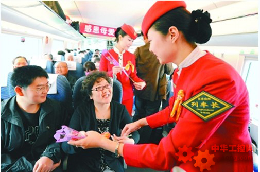 5月9日母親節,列車長徐穎將康乃馨獻給乘坐京津高鐵的一位母親。當天京津高鐵的乘務員們準備了5000束康乃馨,向乘坐列車的母親們送去祝福。 新華社記者 劉海峰攝