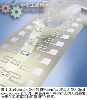 多數較新型RFID體係結構的開發者都把低成本轉發器(或稱標簽)作為體係結構的基礎,它們由一塊用於數據存儲與通信的IC以及一根外部天線組成。標簽有兩個基本類型:無源型和有源型。無源標簽不含電源,並依靠來自閱讀器的射頻信號在天線中感生小電流,該電流足以發射響應信號。RFID標簽通過改變來自閱讀器的射頻信號的反射能量大小來發射數據。無源標簽的工作距離可達30英尺,這取決於閱讀器的功率輸出、天線結構、工作頻率。Bielomatik公司的RF-LoopTag是一種可擴充的天線裝置,同時提供短距離和中距離無源RFID標簽(圖1)。