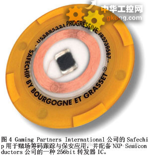 嵌入式RFID技ji術shu還hai非fei常chang適shi合he於yu快kuai速su桌zhuo麵mian賭du博bo,其qi中zhong的de作zuo弊bi和he手shou法fa是shi難nan以yi檢jian測ce的de。借jie助zhu適shi當dang的de數shu據ju記ji錄lu工gong具ju,賭du場chang經jing營ying者zhe就jiu能neng監jian視shi參can賭du者zhe的de行xing動dong,以yi便bian檢jian測ce撲pu克ke牌pai的de計ji數shu,調tiao整zheng獎jiang勵li,並bing盡jin量liang減jian少shao發fa牌pai者zhe的de錯cuo誤wu。例li如ru,InternationalGameTechnology公司和ProgressiveGamingInternational公司聯合開發了TableiD桌麵賭博自動化係統,它結合了一個基於軟件的桌麵管理器和一係列RFID芯片掃描模塊。最新的RFID賭博芯片工作於13.56MHz,存儲容量超過10kbit。在賭博期間,每個位置的芯片閱讀器識別並記錄每個參賭者的賭注。TableiD係(xi)統(tong)計(ji)算(suan)參(can)賭(du)者(zhe)的(de)下(xia)注(zhu)模(mo)式(shi),總(zong)結(jie)發(fa)牌(pai)者(zhe)的(de)活(huo)動(dong),並(bing)且(qie)每(mei)小(xiao)時(shi)記(ji)錄(lu)一(yi)次(ci)參(can)賭(du)者(zhe)所(suo)做(zuo)的(de)決(jue)定(ding)。該(gai)係(xi)統(tong)無(wu)需(xu)用(yong)戶(hu)幹(gan)預(yu)就(jiu)能(neng)自(zi)動(dong)更(geng)新(xin)平(ping)均(jun)賭(du)注(zhu)和(he)輸(shu)贏(ying)記(ji)錄(lu)等(deng)信(xin)息(xi)。有(you)幾(ji)家(jia)供(gong)應(ying)商(shang)在(zai)製(zhi)造(zao)適(shi)合(he)於(yu)賭(du)桌(zhuo)自(zi)動(dong)化(hua)並(bing)基(ji)於(yu)RFID的賭幣。例如,GamingPartnersInternational公司在生產SafechipbyBourgogneetGrasset(圖4)。