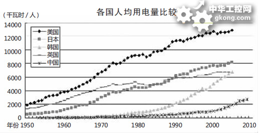 從cong人ren均jun用yong電dian量liang增zeng長chang態tai勢shi來lai看kan,各ge國guo在zai工gong業ye化hua階jie段duan都dou經jing曆li了le較jiao快kuai增zeng長chang過guo程cheng,工gong業ye化hua後hou期qi或huo完wan成cheng工gong業ye化hua之zhi後hou增zeng速su大da幅fu降jiang低di,總zong體ti呈cheng現xian增zeng長chang率lv波bo動dong下xia降jiang或huo相xiang對dui穩wen定ding的de趨qu勢shi。如ru美mei國guo在zai二er戰zhan後hou到dao上shang世shi紀ji70年代初期,人均用電量增長近4倍,人均裝機增長近3倍。後由於爆發石油危機和經濟危機,經濟進入“滯脹”階段,加之國民節約意識增強,人均裝機容量和人均用電增長較緩慢。日本上世紀50年代中期到60年代末期,是經濟高速增長時期,電力需求大增,人均電力水平增速較快。70年代的兩次石油危機對日本打擊較大,經濟增長放緩,電力需求增長放緩。英國二戰後到上世紀70年代中期,人均電力消費變化趨勢與美國基本相同,經濟平穩增長使得人均用電量和人均裝機容量不斷升高。1972年到80年代末期,經濟出現負增長,人均裝機容量開始下滑,人均用電量也停滯不前。90年代初到目前,經濟始終低速平穩發展,人均裝機容量和人均用電量小幅上升。韓國從1972年進入工業化發展時期,人均用電量和人均裝機容量不斷增加。1992年以後進入新經濟時代,經濟結構調整優化,居民和第三產業用電需求迅速增長,人均用電量和人均裝機容量大大提高。