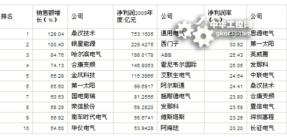 世界電氣100強在2009年淨利潤超過100億元的有5家,利潤超過50億元的企業主要是跨國的500強企業,超過10億元的有22家,有6家出現了虧損。利潤率超過10%的有44家,超過20%的有14家。