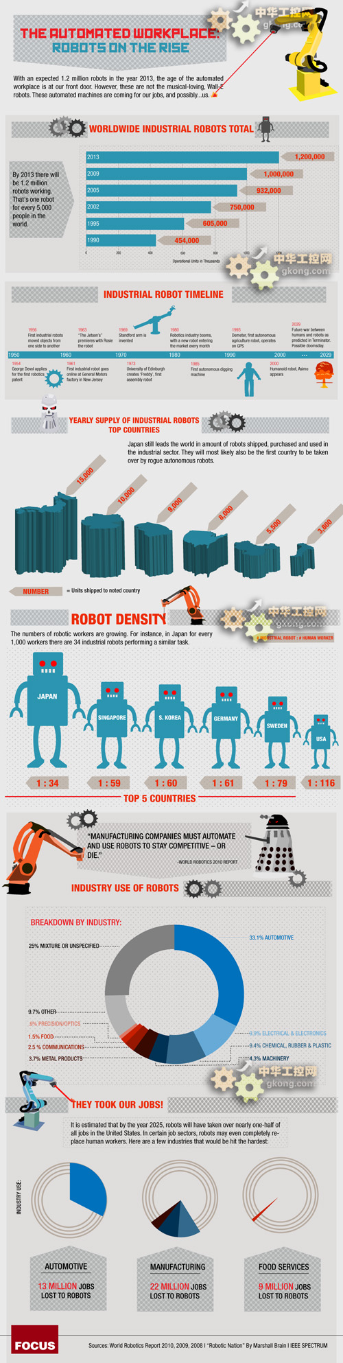 作zuo為wei一yi個ge機ji器qi人ren行xing業ye的de從cong業ye人ren員yuan,筆bi者zhe相xiang信xin機ji器qi人ren會hui改gai變bian這zhe個ge社she會hui的de發fa展zhan。機ji器qi人ren隻zhi是shi另ling外wai一yi種zhong自zi動dong化hua的de工gong具ju,它ta設she計ji之zhi初chu的de目mu的de是shi為wei代dai替ti人ren類lei做zuo那na些xie危wei險xian,髒zang亂luan,枯ku燥zao及ji一yi些xie人ren類lei不bu適shi宜yi做zuo的de工gong作zuo的de。比bi如ru在zai鑄zhu造zao車che間jian,高gao溫wen下xia鑄zhu件jian的de取qu放fang操cao作zuo;半導體車間晶圓的處理;太陽能矽片的的化學清洗(有HF等強酸性化學物品)等都是不適宜人類操作的,這種應用在像日本美國新加坡這樣的國家,大量的用機器人來代替人來作業。