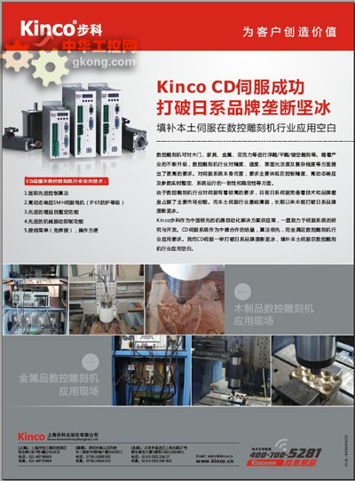 Kinco歩科作為中國領先的機器自動化解決方案供應商,一直致力於伺服係統的研究與開發。CD伺服係統作為中德技術的結晶,算法領先、完全滿足數控雕刻行業應用要求。我司伺服一舉打破日係品牌壟斷堅冰,填補本土伺服在數控雕刻機行業應用空白。