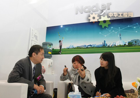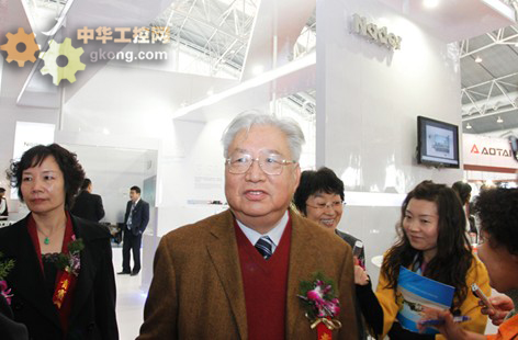 中國電器工業協會終身名譽會長陸燕蓀在良信展台前接受記者訪問