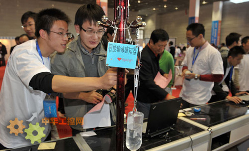 在中國國際物聯網博覽會大學生創意大賽上,一名大學生在展示智能輸液。