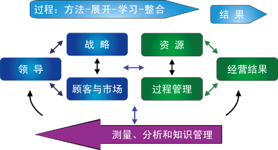 過程旨在結果,結果通過過程取得,並為過程的改進和創新提供導向。“領導”掌控著組織前進的方向,並密切關注著“經營結果”。“領導”、“戰略”、“顧客與市場”構成“領導作用”三角,是驅動性的;“資源”、“過程管理”、“經營結果”構成“資源、過程和結果”三角,是從動性的。而“測量、分析與改進”是組織動作之基礎,是鏈接與兩個三角的“鏈條”,並轉動著改進和創新的PDCA之輪。