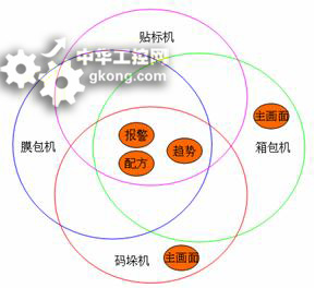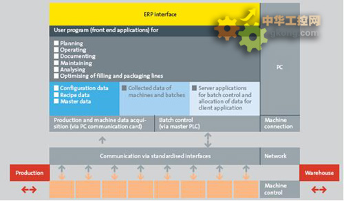 Krones的這個圖顯示了其整廠管理係統架構,各個生產單元的數據如機器狀態、批次控製數據等通過標準的數據總線到了上位,而設備的配置參數、配方數據、主控數據等也通過標準總線下達到生產設備級,生產計劃數據、操作控製、文檔、維護、分析、優化等在上一管理級來實現,通過用戶接口與ERP係統進行連接,實現整個工廠的數據管理。