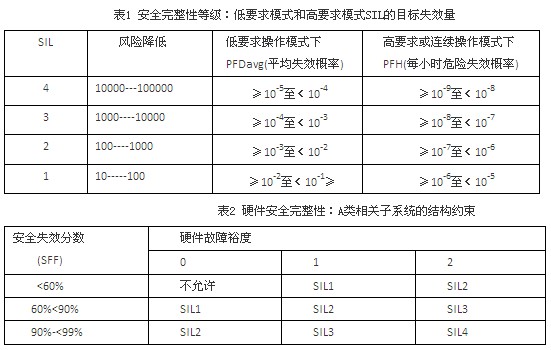 安全完整性等級是用來規定分配給SIS安全功能的安全完整性要求的分離等級,記為SIL.共分4個等級,SIL4為最高等級, IEC61508-1規定了目標失效量(見表1)。