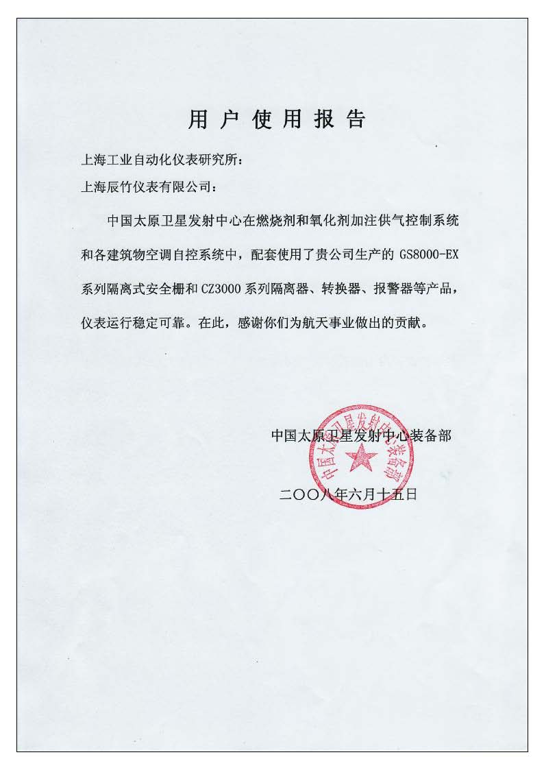 從2003年開始,我國太原、酒泉、西昌三大衛星發射基地均采用我公司GS8000-EX係列隔離式安全柵、CZ3000係列隔離器、轉換器、報警器等產品,儀表質量穩定可靠、傳輸精度高。好品質贏得好評,好服務讓用戶放心。我們仍將不斷進步,為我國航空航天事業作出貢獻!