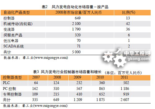 我們對2007~2011年控製器市場容量的估計如表3所示。存控製器的增長趨勢上,我們認為,基於PC的控製方式住未來幾年內仍將是主流的選擇方案,會隨著風電市場的增速而同步增長,而PLC一yi旦dan在zai兆zhao瓦wa級ji別bie的de風feng機ji上shang應ying用yong成cheng功gong,由you於yu其qi性xing能neng穩wen定ding,且qie成cheng本ben相xiang對dui低di廉lian,因yin此ci將jiang獲huo得de高gao速su增zeng長chang。而er專zhuan用yong控kong製zhi器qi由you於yu其qi成cheng本ben高gao,開kai發fa性xing略lve有you欠qian缺que,因yin此ci增zeng長chang速su度du會hui逐zhu漸jian放fang緩huan。