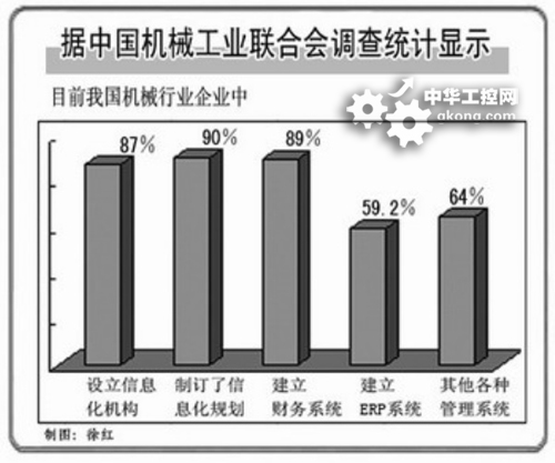 據中國機械工業聯合會調查統計顯示,目前我國機械行業有87%的企業設立了信息化機構,90%的企業在信息化開始前就製訂了信息化規劃。企業管理信息係統的應用也在不斷深入,建立財務係統的企業達到89%,已經基本普及;建立難度較大的ERP係統的比例達到了59.2%;其他各種管理信息化係統的建成比例都超過了64%。