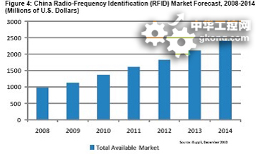 總體來看,中國政府在物聯網上麵的大筆投資將推動中國RFID產業發展。發展物聯網已被列入中國的十二五規劃。盡管RFID生態係統在標準、成本和供應商等方麵仍不成熟,但iSuppli公司認為,未來四年該產業將快速發展。
