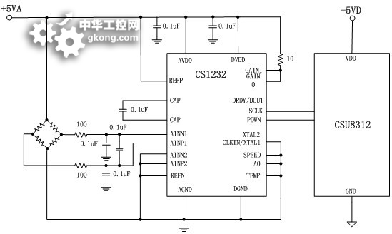 保證信號的完整與幹淨:CS1232片內有兩路差分通道,可用於多通道測量。片上內置低噪聲的儀用放大器,可提供最高128倍的放大倍數,幅度較小的微小信號也可直接測量。CS1232輸出速度可以選擇10Hz或80Hz,采用10Hz的數據速率時,可擬製50Hz 和60Hz的幹擾信號,抗幹擾性好,保證了信號的幹淨。此外CS1232還具有增益溫漂約3.5ppm/℃,並內置溫度傳感器,可以監測環境溫度,有力減小了環境溫度的變換對測量造成的影響。