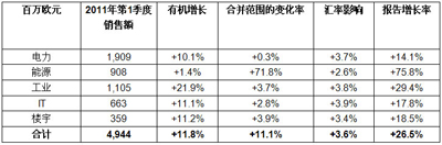 北美(占集團銷售額的23%)表現明顯改善,同比增長+15%。與2010年的走勢不同的是,大多數業務都為增長作出了積極貢獻,不僅包括IT和工業業務,還包括電力和樓宇。