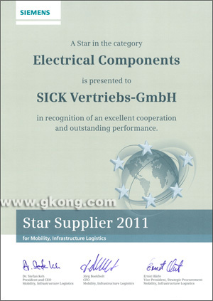 SICK AG 榮獲2011年西門子交通集團最佳供應商。作為領先的智能傳感器產品和傳感器解決方案供應商,SICK 全球服務網絡一直致力於推動自動化事業發展,涉及領域包括工廠自動化,物流自動化和過程自動化,這意味著作為SICK的合作夥伴,無論您置身何處,我們始終伴您左右,恭候調遣。SICK 在全球50 多個國家和地區擁有分支機構、眾多銷售辦事處及關聯企業,SICK 在全球分布的物流中心,以及時準確交付為宗旨,進一步縮短交貨期,削減維修和倉儲成本。