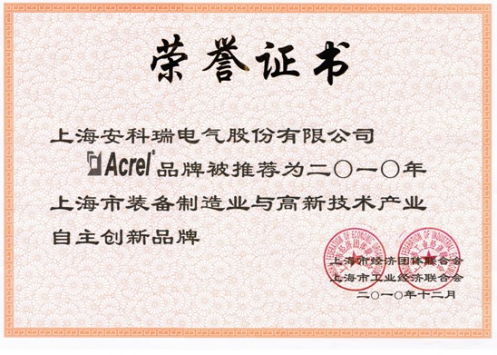 2011年1月20日,上海市經濟團體聯合會在市政協文化俱樂部四樓劇場召開2011年春節聯歡會暨表彰頒獎大會。我司“Acrel”英文商標連續三年獲得上海市裝備製造業與高新技術產業“自主創新品牌”稱號。