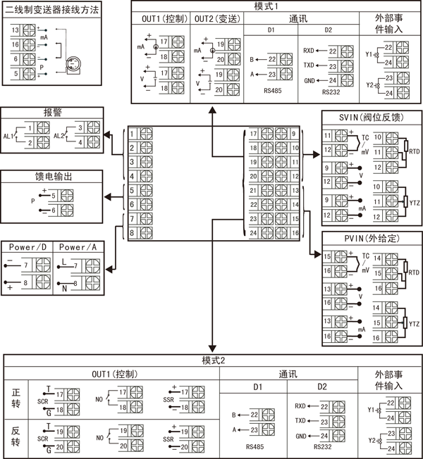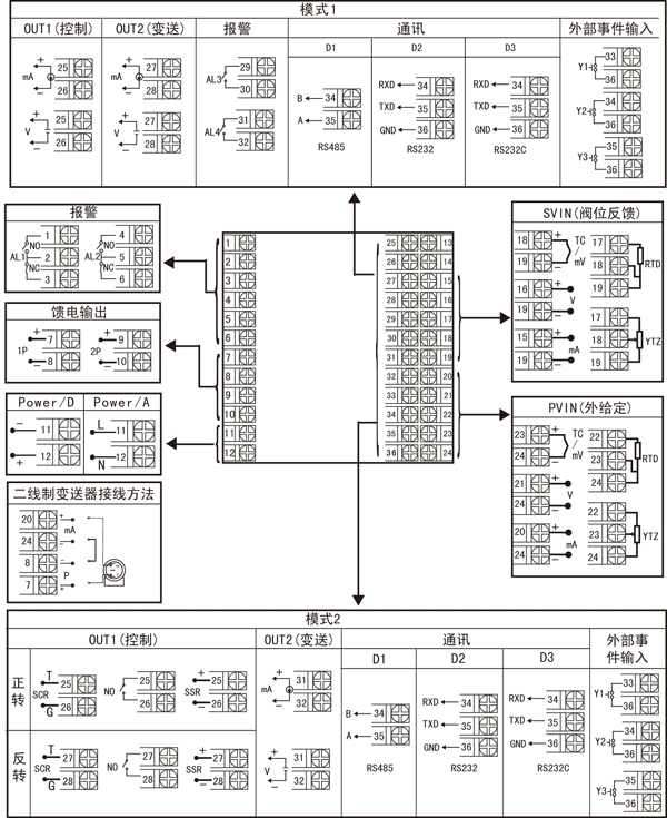 | 注:上述接線圖中在同一組端子標有不同功能的,隻能選擇其中一種功能。如RS485和RS232在同一組接線端子上,隻能選擇一種。 |