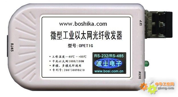 波仕電子的以太網光纖收發器係列再添新產品-OPET1G和OPET1G1二款新一代以太網光纖通信產品,直接從以太網口透明轉換出光纖進行遠程傳輸。 此前OPET100L產品實現百M,而OPET1G則以同樣大小實現了到1000M(1G)、同時達到工業級工作溫度範圍(—40~+80℃)的突破。 波仕電子的OPET1G微型千兆工業以太網光纖收發器的特點: 1. 可以將IEEE802.3 z/u/x標準的1000/100/10M以太網電纜轉換成為千兆光纖進行傳輸(SFP模塊、LC頭),同時1000M以太網向下兼容100M和10M。 2. 顛覆了傳統以太網光纖收發器的尺寸和外形,屏棄了傳統的大方鐵殼的外形。 3. 單模和多模光纖中都可以傳輸的技術,全雙工/半雙工模式自動適應、直連線/交叉線自動適應。 4. 無須修改已有的軟件、無須驅動程序。 5. OPET1G可以成對使用、也可以與其他標準以太網光信號進行通信。 以太網光纖收發器係列采用光纖作為通信傳輸介質,具有隔離高電壓、防電磁幹擾、傳輸距離遠等優點。 同時本產品受以下中國專利保護:200730098650、200630307752,侵權必究! 產品參數參考: