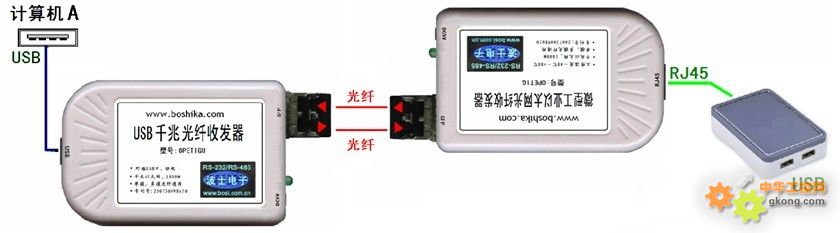 用光纖來構築遠程USB口的最實用的方法是將計算機的以太網用光纖延長後再在遠端加以太網/USB轉換器。波仕電子的OPET-USB是最新一代USB光纖通信產品,實現了USB信號在以太網光纖中的遠程傳輸。