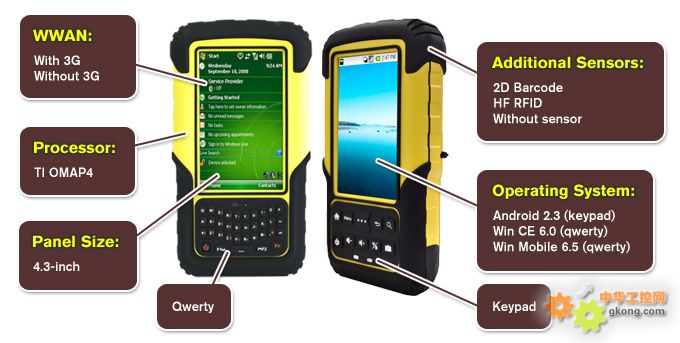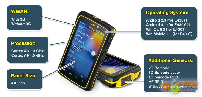京融電在手持設備方麵,專注於3.5到4.3尺寸且擁有與手持設備完美搭配之標準功能,京融電為了滿足客戶的需求,因此我們采用多種數據采集部件(可選的條形碼、RFID感光器、可選3G以及多種操作係統的配置),京融電將致力提供客戶所想要的設備如: