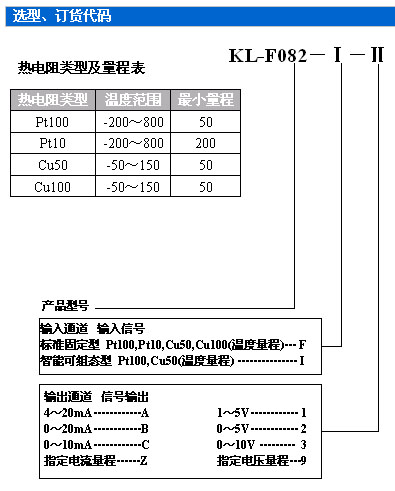¶©»õÐëÖª£º1¡¢²ÎÕÕÑ¡Ð;ÙÀý£¬ÕýÈ·¹æ·¶Êéд¶©»õÐͺŴúÂë¡£¾ÙÀý1 ÊäÈ룺Pt100 0¡«100¡æ / Êä³ö£º 4¡«20mA ¶©»õ´úÂëΪ£ºKL-F082-FA£¨Pt100 0¡«100¡æ£©¾ÙÀý2£¨ÖÇÄÜ¿É×é̬£© ÊäÈ룺Pt100 0¡«150¡æ / Êä³ö£º 4¡«20mA ¶©»õ´úÂëΪ£ºKL-F082-IA£¨Pt100 0¡«150¡æ£©