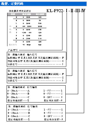 ¶©»õÐëÖª£º 1¡¢²ÎÕÕÑ¡Ð;ÙÀý£¬ÕýÈ·¹æ·¶Êéд¶©»õÐͺŴúÂë¡£ ¾ÙÀý£¨ÖÇÄÜ¿É×é̬£© ÊäÈ룺1·¡¢2· K 0¡«1300¡æ Êä³ö£º1·¡¢2· 4¡«20mA ¶©»õ´úÂëΪ£ºKL-F922-IIAA£¨K 0¡«1300¡æ£©