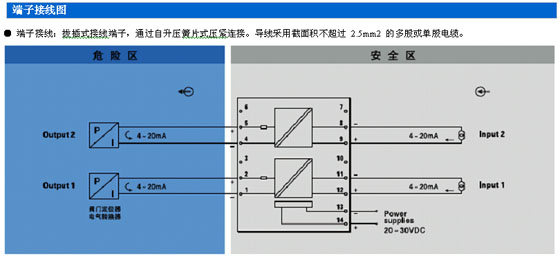 ±¾¸ôÀëʽ°²È«Õ¤ÐèÒª¶ÀÁ¢¹©µç£¬¹©µçµçÔ´£ÊäÈë»ØÂ·£ Êä³ö»ØÂ·Ö®¼äµç´Å¸ôÀë¡£ ¡ñ Çý¶¯Î£ÏÕÏÖ³¡±¾°²É豸£¬¸ºÔؿɸߴï750¦¸¡£ ¡ñ 4¡«20mAÊäÈ룬¸ôÀëÊä³ö4¡«20mA¡£ ¡ñ Ä£¿é»¯±íоÉè¼Æ£¬ÎÞÐèÁãµãºÍÂú¶Èµ÷½Ú¡£ ¡ñ ´øÓй¤×÷µçԴָʾµÆ¡£ ¡ñ ˫ͨµÀ£¬¶þÈë¶þ³ö£¬±¾°²ÊäÈë»ØÂ·[Exia]IIC£¬ÊäÈë »ØÂ·¹ýÁ÷±£»¤¡£ ¡ñ ¼´²å¼´°Îʽ½ÓÏß¶Ë×Ó£¬DINµ¼¹ì¿¨Ê½°²×°¡£