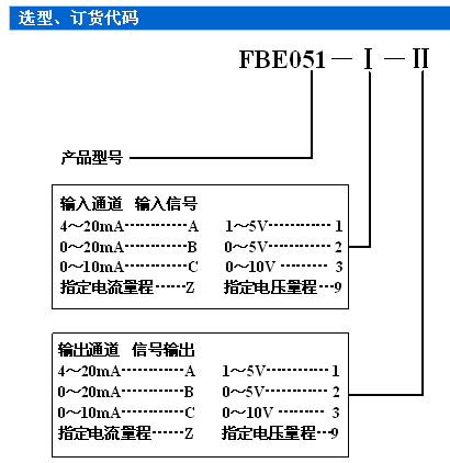 ¶©»õÐëÖª£º 1¡¢²ÎÕÕÑ¡Ð;ÙÀý£¬ÕýÈ·¹æ·¶Êéд¶©»õÐͺŴúÂë¡£ ¾ÙÀý1£º ÊäÈ룺 4¡«20mA Êä³ö£º4¡«20mA ¶©»õ´úÂëΪ£ºFBE051-AA ¾ÙÀý2£º ÊäÈ룺 4¡«20mA Êä³ö£º0¡«5V ¶©»õ´úÂëΪ£ºFBE051-A2