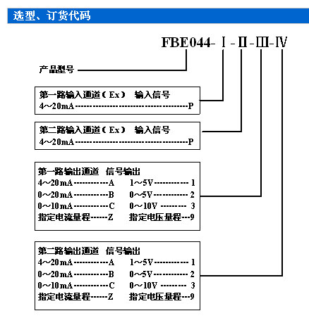 ¶©»õÐëÖª£º 1¡¢²ÎÕÕÑ¡Ð;ÙÀý£¬ÕýÈ·¹æ·¶Êéд¶©»õÐͺŴúÂë¡£ ¾ÙÀý1£ºÊäÈ룺1·¡¢2· ±äËÍÆ÷4¡«20mA Êä³ö£º1·4¡«20mA £»2·4¡«20mA ¶©»õ´úÂëΪ£ºFBE044-PPAA ¾ÙÀý2£ºÊäÈ룺1·¡¢2· ±äËÍÆ÷4¡«20mA Êä³ö£º1·4¡«20mA £»2·0¡«5V ¶©»õ´úÂëΪ£ºFBE044-PPA2