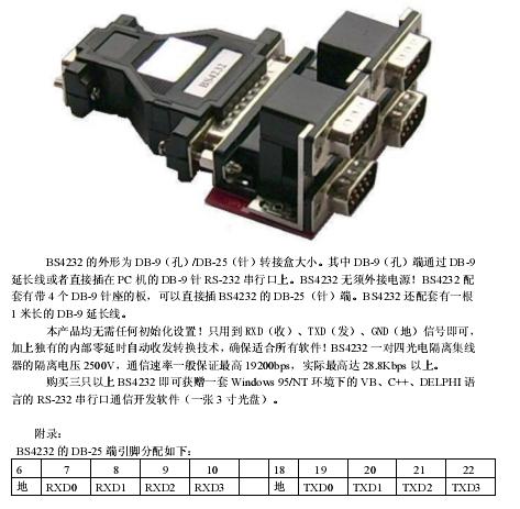 RS-232 Ò»¶ÔËĹâµç¸ôÀ뼯Ï߯÷£¨ÐͺţºBS4232£©ÓÃÓÚʵÏÖÒ»¸ö RS-232 ´®ÐпÚÓë¶à¸ö£¨1¡¢2¡¢3»ò 4¸ö£©RS-232 ´®ÐпڵĹâµç¸ôÀëͨÐÅÁ¬½Ó¡£BS4232 ͬʱҲʹ´«Í³µÄRS-232 ¿ÚÄܹ»ÊµÏÖ¶à»úͨÐÅ¡£BS4232»¹ÊµÏÖÁËRS-232ÓëËĸöÀ©Õ¹RS-232¿ÚÖ®¼äµÄ¹âµç¸ôÀë¡£BS4232¡¢ÒѾÓÐ4¸öÏÂλ»úµÄ²å×ù£¨DB-9 Õë×ù£©£¬ÎÞÐèÐÞ¸ÄÈí¼þ¡¢ÎÞÐ빩µç¡£BS4232 µÄ RS-232 ´®ÐÐ