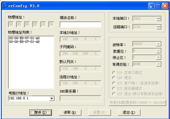 ½«2¸ö²¨Ê¿ÒÔÌ«Íø/´®¿Úת»»Æ÷¶¼²åÉÏ£¬ÔÙÔËÐÐCRConfig.exe¡£°´¡°ËÑѰ"£¬·¢ÏÖÓÐ2¸öIPµØÖ·(Èçͼ4)¡£¾ÍÊÇ2¸ö²¨Ê¿ÒÔÌ«Íø/´®¿Úת»»Æ÷£¬ÕâʱµØÖ·²»³åÍ»ÁË¡£