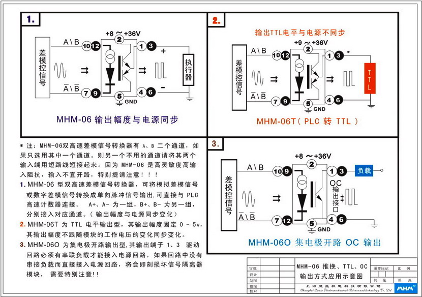 ×¢£º MHM-06 ÊäÈë²îÄ£Ðźš¢Ä£¿éµÄ¹¤×÷µçÔ´·¶Î§¿ÉDC 9 - 30V£¬¶øÊä³ö¸ßµçƽΪ¹¤×÷µçѹ¼õ0.7V MHM-06T ÊäÈë²îÄ£Ðźš¢Ä£¿éµÄ¹¤×÷µçÔ´·¶Î§¿ÉDC 9 - 30V£¬¶øÊä³ö¹Ì¶¨ÎªTTLµçƽ¡£ MHM-06O ÊäÈë²îÄ£Ðźš¢Ä£¿éµÄ¹¤×÷µçÔ´·¶Î§¿ÉDC 9 - 30V£¬¶øÊä³öΪ¼¯µç¼«¿ªÂ·OC¡£