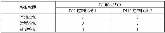 ¡¡¡¡¿ØÖÆÈ¨ÏÞÑ¡Ôñ£¨³ý±£»¤Ä£Ê½Í⣩£º90LÏÔʾµ¥Ôª°´¼ü±¾µØ¿ØÖÆ¡¢DI¶Ë¾ÍµØ¿ØÖÆ¡¢ÉÏλ»úͨѶԶ³Ì¿ØÖÆ¡£DI9¡¢DI10×éºÏʵÏÖÈýλÖÃȨÏÞÑ¡Ôñ¡£Ï±íÖГ0”±íʾ¿ª¹ØÁ¿ÊäÈëδ½Óͨ£¬“1”±íʾ½Óͨ¡£