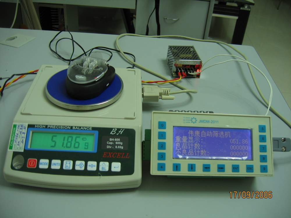ÏêϸÄÚÈÝ£º ¾«Ãô£¨JMDM£©×Ô¶¯É¸Ñ¡ÏµÍ³Óֳƾ«Ãô×Ô¶¯É¸Ñ¡»ú¡¢JMDMÎïÆ·É¸Ñ¡ÏµÍ³¡£ Óë³ÆÖØÆ÷ÅäºÏʹÓ㬹¹³ÉÎïÆ·³ÆÖØÉ¸Ñ¡Æ÷£¬¿ÉÒÔ¶Ô°ë³ÉÆ·½øÐгÆÖØÉ¸Ñ¡£¬É¸Ñ¡³ö ´ïµ½±ê×¼ÖØÁ¿µÄ°ë³ÉÆ·£¬²¢·ÖÀë´ï²»µ½±ê×¼µÄ°ë³ÉÆ·£¬ÊµÏÖÁ˳ÆÉ¸Ò»Ì廯¡£ JMDM³ÆÖØÉ¸Ñ¡ÏµÍ³²ÉÓÃÉîÛÚÊо«ÃôÊý×Ö»úÆ÷ÓÐÏÞ¹«Ë¾×ÔÖ÷Ñз¢µÄ JMDM-2011¹¤Òµ¿ØÖÆÆ÷£¬ÊµÏÖÁ˸߾«¶È¡¢¸ßËÙµÄɸѡ¡¢·ÖÀ룬²¢Óз½±ãµÄÈË»ú ½»»¥½çÃæÏÔʾɸѡ¹ý³Ì¼°½á¹û¡£ JMDM-2011ÊÇĿǰҵÄÚ¹¦ÄܽÏÇ¿¡¢Îȶ¨¿É¿¿¡¢¿¹¸ÉÈÅÄÜÁ¦Ç¿µÄ¹¤Òµ¿ØÖÆÆ÷£¬ ¾ßÓм«¸ßµÄÐԼ۱ȣ¬ÒѾ¼«´óµØÌá¸ßÁ˿ͻ§µÄÉú²úЧÂʺ;¼ÃÐ§Òæ£¬ÒÔÓÅÒìµÄÐÔ ÄܱíÏÖÓ®µÃÁ˹úÄÚÍâÖÚ¶à¿Í»§µÄÐÅÈΣ¬²¢½¨Á¢ÁËÎȹ̳¤¾ÃµÄ˫ӮºÏ×÷¹ØÏµ¡£ ĿǰÒѹ㷺ӦÓÃÓÚÆø¸×¡¢µç´Å·§¡¢¼ÌµçÆ÷¡¢²½½ø¼°ËÅ·þµç»ú¡¢±ÈÀý·§¿ØÖÆ¡¢ ±äƵÆ÷¿ØÖƵȸßËÙ¡¢¸ß¾«¶ÈÄ£ÄâÁ¿ÊäÈëÊä³ö¡¢Êý×ÖÁ¿ÊäÈëÊä³ö³¡ºÏ¡£ ÔÚÈ«¹ú¸÷µØÒѳɹ¦¡¢¹ã·ºÓ¦ÓÃÓÚ³ÆÖØÉ¸Ñ¡Æ÷¡¢¹öÂÖËÍÁÏ»ú¡¢×Ô¶¯ÊÛË®»ú¡¢ÖÆ ´ü»ú¡¢³å´²ËÍÁÏ»ú¡¢·ÛËé»ú¡¢Ó¡Ë¢»ú¡¢Çиî»ú¡¢Ñ¹·Û»ú¡¢Ñ¹Á¦²âÊÔÒÇ¡¢ÒºÑ¹¿ØÖÆ Æ÷¡¢¼¤¹â¿ØÖÆÆ÷¡¢¶à·Î¶ȿØÖÆÆ÷µÈÒªÇó¸ß¾«¶È¡¢¸ßËÙ¶È¿ØÖƵij¡ºÏ»òÉ豸£¬²¢ Ô¶Ïúº£Íâ¡£ Ò»¡¢ ²úÆ·¹¦ÄÜÌØÐÔ 1¡¢¶Ô°ë³ÉÆ·½øÐгÆÖغÍɸѡ£¬¿ÉÉ趨ÎïÆ·µÄ±ê×¼ÖØÁ¿ÒÔ¼°ÎïÆ·µÄÖØÁ¿·¶Î§£» 2¡¢¶Ô´ï±êÖØÁ¿·¶Î§ÄÚµÄÎïÆ·£¬³ÆÖØÉ¸Ñ¡ÏµÍ³½«Çý¶¯Á¼Æ·Æû¸×¶¯×÷£» 3¡¢¶Ô²»´ï±êÖØÁ¿·¶Î§µÄÎïÆ·£¬³ÆÖØÉ¸Ñ¡ÏµÍ³½«Çý¶¯´ÎÆ·Æû¸×¶¯×÷£¬Í¬Ê±Çý¶¯±¨ ¾¯Æ÷·¢³ö±¨¾¯Éù£» 4¡¢³ÆÖØÉ¸Ñ¡ÏµÍ³ÓÐÁ¼Æ·¼ÆÊýºÍ²»Á¼Æ·¼ÆÊýÁ½¸ö¼ÆÊýÆ÷£¬¿Éͳ¼ÆÒѳÆÖØÉ¸Ñ¡µÄÎï Æ·ÊýÁ¿£» 5¡¢³ÆÖؿɾ«È·¶Èµ½0.01¿Ë£» 6¡¢¿ÉÒÔÉ趨³ÆÖصÄÁÙ½çÖØÁ¿£¬µÍÓÚÁÙ½çÖØÁ¿Ê±³ÆÖØÉ¸Ñ¡ÏµÍ³²»»á×÷³öÁ¼Æ·ºÍ´Î Æ·Åжϡ£ ¶þ¡¢ ÔËÐÐ»Ãæ 1. ¿ª»úʱϵͳ½øÈë×Ô¶¯ÔËÐÐ»Ãæ ´ËʱÆô¶¯ÁË×Ô¶¯ÔËÐгÌÐò£¬¿ÉÒÔÕý³£¹¤×÷¡£ 2. ¿ª»ú»ÃæÏÔʾºó½øÈëÔËÐÐ»Ãæ ´ËʱҺ¾§ÏÔʾÆÁÖÐÉϲ¿ÏÔʾ¡°¾«Ãô×Ô¶¯É¸Ñ¡»ú¡±£»×óϽÇÏÔʾ¡°ÖØÁ¿ÏÔʾ£¬Á¼ Æ·¼ÆÊý£¬²»Á¼Æ·¼ÆÊý¡±£¬ÆäÖÐÖØÁ¿ÏÔʾָÏÖÔÚµç×ӳƷ´À¡µÄÖØÁ¿ÊýÖµ(µ¥Î»ÊÇ ¿Ë)£¬Á¼Æ·¼ÆÊýָɸѡ»úÔÚ¹¤×÷¹ý³ÌÖÐɸѡ³öµÄÁ¼Æ·ÊýÁ¿£¬²»Á¼Æ·¼ÆÊýÊÇÖ¸ ɸѡ»úÔÚ¹¤×÷¹ý³ÌÖÐɸѡ³öµÄ²»Á¼Æ·ÊýÁ¿¡£ Èý¡¢ ²ÎÊýÐÞ¸Ä 1. ÈçºÎ½øÈëÉèÖÃ״̬ Éϵçºó¿ØÖÆÆ÷Ö±½Ó½øÈëÔËÐÐ״̬£¬´Ëʱ°´Ãæ°åÉϵġ°ENT¡°°´Å¥¿É½øÈëÉèÖÃ״̬¡£ 2. ÈçºÎÐ޸IJÎÊý ×ó©pÓÒ¶þ¸ö·½Ïò¼üÓÃÓÚÒÆ¶¯¹â±ê£¬Ñ¡ÔñÒª¸Ä±äµÄÊý×Ö¡£µ±¹â±êµ½´ïÒª¸Ä±äµÄÊý×Ö Ê±£¬ÊäÈëÄãÏëÉ趨µÄÊý×Ö£¬Êý×־Ͷ¨ÏÂÀ´ÁË¡£ ÉèÖÃ״̬µÄÌØÕ÷ÊÇÒº¾§ÆÁµÄÓÒ°ë±ßÓÐÒ»¸ö¹â±ê£¬ÇÒ°´×ó©pÓÒ¶þ¸ö·½Ïò¼üʱ¿Éʹ¹â ±êÒÆ¶¯¡£ 3. ÈçºÎÉèÖòÎÊý 1£©²ÎÊýÉèÖÃ»Ãæ¹²ÓÐÒ»¸ö£¬¼´Ö÷ÉèÖÃ»Ãæ£¬ÈçÏ£º ÎïÆ·±ê×¼ÖØÁ¿£º¼´ÒªÉ¸Ñ¡ÎïÆ·µÄ±ê×¼ÖØÁ¿£» 0000.00¡ª¡ª9999.99 µ¥Î»£º¿Ë ÖØÁ¿Îó²î·¶Î§£º¼´ÒªÉ¸Ñ¡ÎïÆ·µÄ¿É½ÓÊÜÖØÁ¿Æ«²î·¶Î§£» 0000£®00¡ª¡ª9999.99 µ¥Î»£º¿Ë ÎïÆ·ÁÙ½çÖØÁ¿£º¼´É¸Ñ¡ÏµÍ³¿ªÊ¼×÷ÖØÁ¿É¸Ñ¡µÄ×îСÎïÆ·ÖØÁ¿£» 0000£®00¡ª¡ª9999.99 µ¥Î»£º¿Ë ÖØÁ¿¶¶¶¯·¶Î§£º ¼´É¸Ñ¡ÏµÍ³²âµÃµç×ӳƵÄÖØÁ¿Îó²îÔÚÖØÁ¿¶¶¶¯·¶Î§ÒÔÄÚʱ£¬¼´ ÈÏΪϵͳÎȶ¨¿É¿¿£»×÷³öÖØÁ¿É¸Ñ¡¶¯×÷£» 0000£®00¡ª¡ª9999.99 µ¥Î»£º¿Ë 2£©ÔÚ²ÎÊýÉèÖÃ»ÃæÏ°´ESC¼ü¾ÍÍ˳ö²ÎÊýÉèÖÃ»Ãæ¡£ ËÄ¡¢ ²Ù×÷½éÉÜ 1. ¿ª»úºó½øÈëÔËÐÐ»Ãæ£¬ÈôÐèÐ޸IJÎÊýÔò½øÈë²ÎÊýÉ趨»Ã棻 2. ÔÚÔËÐÐ»Ãæ°´0¼üÔòÁ¼Æ·¼ÆÊýÇåÁã,°´Ò»¼üÔò´ÎÆ·¼ÆÊýÇåÁ㣻 3. ¿ØÖÆÆ÷Óëµç×Ó³ÆÖ®¼äµÄͨÐÅÊÇÓÃRS232ͨÐÅ£¬²¨ÌØÂÊΪ9600±ÈÌØ,ÆæÐ£ Ñé¡£ 4. µ±¼ì²âµ½Á¼Æ·Ê±·äÃùÆ÷²»·¢Éù£¬Á¼Æ·ÍƳöÆû¸×¶¯×÷£»µ±¼ì²âµ½´ÎƷʱ·ä ÃùÆ÷·¢Éù£¬´ÎÆ·ÍÆ³öÆû¸×¶¯×÷¡£