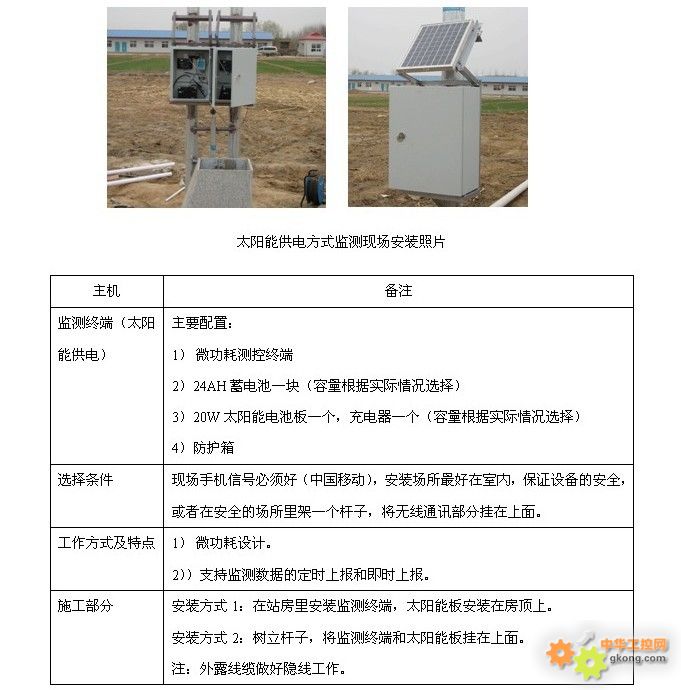 ÊÊÓÃÓÚʹÓÃÌ«ÑôÄÜ×÷Ϊ¹©µçµçÔ´µÄ¼à²âÏÖ³¡£¬Ì«ÑôÄܵçÔ´·ÖΪÈý²¿·Ö£¬Ì«ÑôÄÜµç³Ø°å¡¢Ì«ÑôÄܳäµç¿ØÖÆÆ÷¡¢Ç¦ËáÐîµç³Ø¡£¸ù¾ÝÏÖ³¡ÓõçÉ豸£¨°üº¬Î¢¹¦ºÄ²â¿ØÖÕ¶ËÓëÏÖ³¡²É¼¯É豸£©µÄ¹¦ÂÊÀ´Ñ¡Ôñ¹âµç³Ø°åµÄ´óСÓëÐîµç³ØµÄÈÝÁ¿¡£