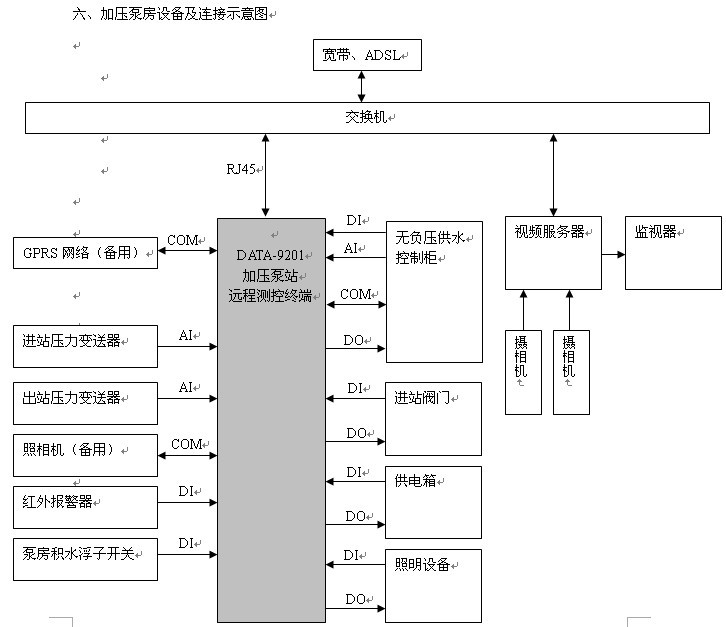 ϵͳÖ÷Òª°üÀ¨£ºµ÷¶ÈÖÐÐÄ·þÎñÆ÷¡¢Öµ°àÈËÔ±¼ÆËã»ú¡¢Ð¡Çø¼ÓѹվԶ³Ì¼à¿ØÏµÍ³Èí¼þ¡¢Í¨ÐÅÍøÂç¡¢Ð¡Çø¼Óѹ±ÃÕ¾Ô¶³Ì²â¿ØÖÕ¶Ë¡¢ÎÞ¸ºÑ¹¹©Ë®É豸¡¢ÕÕÏà»ú¡¢ÉãÏñ»úµÈ¡£