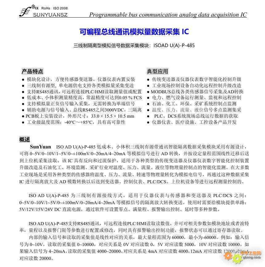 ±¾´ÎÑÐÖÆµÄSunYuan ISO AD U1-P1-485µÍ³É±¾¡¢Ð¡Ìå»ýÈýÏßÖÆÓÐÔ´´øÍ¨Ñ¶ÖÇÄܸôÀëÊý¾Ý²É¼¯Ä£¿é²ÉÓÃÓÐÔ´Éè¼Æ£¬¿É½«0~5V/0~10V/1~5V/0~±100mV/0~20mA/4~20mAµÈÄ£ÄâÐźŽøÐÐADת»»£¬²¢°´É趨Á¿³Ì·¶Î§ÏßÐÔÇ¨ÒÆºóË͵½ÉÏλ»ú²É¼¯¶ÁÈ¡¡£¸ÃIC¾ßÓз´ÏòºÍ¹ýÁ÷±£»¤£¬ÊÊÓÃÓÚ¸÷ÖÖÀàÐ͵Ĵ«Í³±äËÍÆ÷¼°ÒÇÆ÷ÒDZíÊý×ÖÖÇÄÜ»¯¿ØÖÆ×°ÖÃÉý¼¶¸ÄÔ켰ʯÓÍ»¯¹¤¡¢»·¾³¼à²â¡¢²É¿óÐÐÒµ¶Ôζȡ¢Ñ¹Á¦¡¢Á÷Á¿¡¢ÒºÎ»µÈÎïÀíÁ¿¿ØÖƵãµÄÖÇÄÜ»¯¼à²â¡£ÔÚ´ó¶àÊý¹¤ÒµÏÖ³¡ÊDzÉÓø÷ÖÖÀàÐ͵Ĵ«¸ÐÆ÷½«Î¶ȡ¢Ñ¹Á¦¡¢Á÷Á¿¡¢×ªËÙµÈÎïÀíÁ¿×ª»¯ÎªÄ£ÄâµçÐźţ¬ÔÙͨ¹ýÕâÖÖÊý¾Ý²É¼¯IC½øÐиôÀë·Å´ó¼°ADÄ£Êýת»»ÒÔºóË͵½±äËÍÆ÷¡¢¿ØÖÆÒÇ±í¡¢PLC/DCS¡¢ÉÏλ»úÉ豸µÈ½øÐÐÔ¶³Ì²âÁ¿¿ØÖÆ¡£