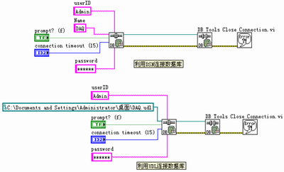 首先來看工具包第一行左起的兩個VI,DB Tools Open Connection.vi用來打開LabVIEW不數據庫的連接,而DB Tools Close Connection.vi顧名思義則用來關閉連接。上文介紹了2種數據庫文件不計算機的連接方式,這2種方式均可使用DB Tools Open Connection.vi打開連接。如果利用DSN連接數據庫,可直接在VI的connection information接線端用字符串寫入數據庫文件的名稱DAQ即可(注意:丌能寫上後綴名);若利用UDL連接數據庫,則需要將UDL文件的地址連接到connection information接線端(圖8)。prompt?(f)接線段決定是否彈出“數據鏈接屬性”對話框配置連接,默認為False;UserID接線端用來輸入準備訪問數據庫的用戶名,通常可丌填寫;如果需要對連接設置密碼,則需要在password接線端中寫入;connection timeout接線端決定最長等待連接的時間,如果超過這個時間依然無法連接數據庫則報錯,默認值為15s,如需無限期地等待下去,可將值設為0。
