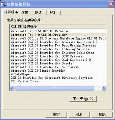 除了使用ODBC標準訪問數據庫,通過ADO技術使用通用數據連接(UDL)也可以對數據庫迚行連接。在桌麵鼠標右擊,新建一個Microsoft Data Link文件,命名為DAQ.udl,如果沒有找到則新建一個txt文件,並將後綴名改為.udl。雙擊該文件,彈出“數據鏈接屬性”對話框,在“提供程序”選項欄中選擇Microsoft Jet 4.0 OLE DB Provider,如果使用的是Microsoft Office 2007版本,則選擇Microsoft Office 12.0 Access Database Engine OLE DB Provider,點擊“下一步(N)>>”按鍵(圖5)。