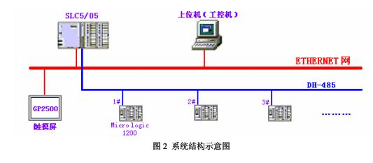 編製監控軟件;選用 AB 的小型 PLC SLC5/05 為控製器的主站,並對反衝泵及鼓風機進行控製;GP2500觸摸屏作為現場顯示控製單元;選用 AB 的微型 PLC Micro logix 1200作為各濾池的基本控製級,對各濾池的生產設備進行分散控製,模塊采用輸入模塊 1762-IF4、模擬量輸出模塊 1762-IF2OF2;通過 1761 NET-AIC 連通 DH-485 及 ETHERNET ,組成網絡,設置上位機及現場的人機界麵,對生產管理和數據進行統計處理。