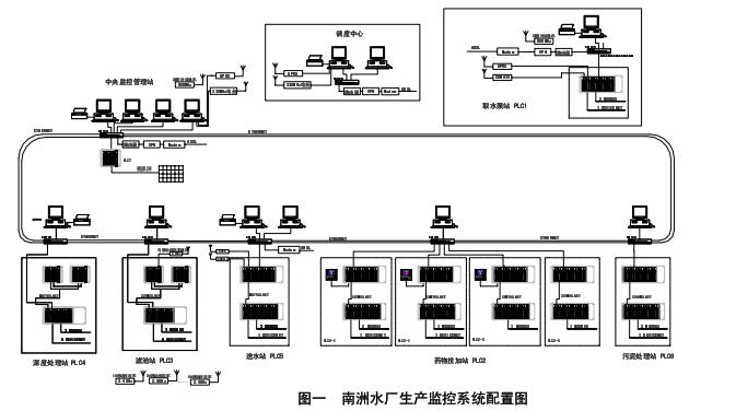 控製排泥車等移動設備的小型 PLC 通過低功率、近距離的無線傳輸設備與子站主控 PLC 通訊。水廠與 30km外的取水泵站則通過 VPN 及無線方式通訊方式,監測源水泵站狀態。水廠內部監控係統以多任務平台上的實時監控、開發和管理軟件組成工控局域網和管理以太網。監控係統框圖見圖一所示。