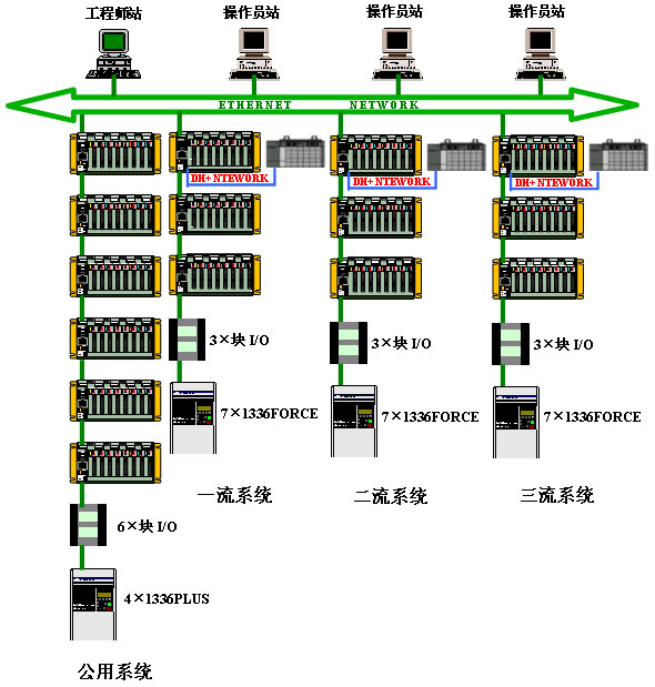 主機架通過CPU上的通道1B(組態為Remote I/O Scanner方式)外帶了2隻擴展機架、3塊Remote I/O模板以及7台1336 FORCE變頻器;另外,采用了3套A-B公司的小型產品SLC 500 分別用於每流的火焰切割機的自動控製。SLC 500 PLC通過CPU上的DH+通訊口與PLC-5/40E的CPU上的通道1A通訊口(配置為DH+)連接構成了DH+網以實現數據交換。