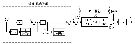 式中: 為操作量, 為偏差, 分別為比例係數、積分時間、微分時間; 為微分增益,一般取 。設定值濾波器用可編程數字調節器提供的功能塊組態實現。其中2自由度化係數α,β,γ分別取為α=0.4,β=1.25,γ=0.5。PID參數 按常規1自由度PID參數整定法整定。