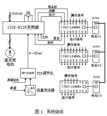 工藝要求在渣漿泵機旁設操作箱,主控製室設操作台,而變頻器安裝在配電室裏的變頻櫃中。主要操作有啟動、停止、複位、工頻/變頻轉換並有信號燈顯示工作狀態。在操作台、操作箱、變頻器櫃各設1台MicroLogix 1200係列的1762-L24BWA可編程序控製器,3台控製器通過高級接口轉換器AIC+用雙絞線連接組成DH485網絡實現異地操作。從而簡化了配線,提高了係統的可靠性。