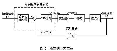 渣漿流量由流量傳感器檢測,轉換成4~20mA信(xin)號(hao)送(song)至(zhi)可(ke)編(bian)程(cheng)數(shu)字(zi)調(tiao)節(jie)儀(yi)輸(shu)入(ru),流(liu)量(liang)設(she)定(ding)由(you)上(shang)位(wei)機(ji)給(gei)出(chu)送(song)調(tiao)節(jie)儀(yi)外(wai)給(gei)定(ding),控(kong)製(zhi)運(yun)算(suan)利(li)用(yong)調(tiao)節(jie)儀(yi)提(ti)供(gong)的(de)功(gong)能(neng)塊(kuai)組(zu)態(tai)實(shi)現(xian)。調(tiao)節(jie)儀(yi)麵(mian)板(ban)上(shang)可(ke)實(shi)現(xian)手(shou)動(dong)調(tiao)節(jie)流(liu)量(liang)及(ji)手(shou)動(dong)/自動轉換操作。係統組成如圖1所示。
