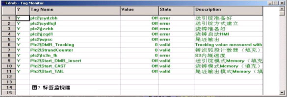 用調試方便評價RSView32係統,無論如何都不過分。首先,畫麵編輯和運行間的切換非常快,提高了程序調試過程的速度。RSView32係(xi)統(tong)以(yi)表(biao)格(ge)形(xing)式(shi)的(de)標(biao)簽(qian)監(jian)視(shi)器(qi)和(he)命(ming)令(ling)窗(chuang)口(kou)是(shi)程(cheng)序(xu)調(tiao)試(shi)中(zhong)必(bi)然(ran)用(yong)到(dao)的(de)兩(liang)個(ge)工(gong)具(ju)。兩(liang)者(zhe)作(zuo)為(wei)畫(hua)麵(mian)控(kong)件(jian)均(jun)可(ke)被(bei)編(bian)入(ru)畫(hua)麵(mian)程(cheng)序(xu)。兩(liang)者(zhe)結(jie)合(he)起(qi)來(lai),可(ke)在(zai)程(cheng)序(xu)運(yun)行(xing)中(zhong)在(zai)命(ming)令(ling)窗(chuang)口(kou)裏(li)發(fa)命(ming)令(ling),在(zai)標(biao)簽(qian)監(jian)視(shi)器(qi)中(zhong)看(kan)命(ming)令(ling)執(zhi)行(xing)的(de)結(jie)果(guo)。用(yong)這(zhe)種(zhong)方(fang)法(fa)察(cha)看(kan)程(cheng)序(xu)的(de)中(zhong)間(jian)結(jie)果(guo),跟(gen)蹤(zong)中(zhong)間(jian)結(jie)果(guo)的(de)變(bian)化(hua)特(te)別(bie)有(you)用(yong)。一(yi)般(ban)的(de)做(zuo)法(fa)是(shi),將(jiang)標(biao)簽(qian)按(an)設(she)備(bei)或(huo)工(gong)藝(yi)類(lei)型(xing)分(fen)別(bie)定(ding)義(yi)到(dao)不(bu)同(tong)的(de)標(biao)簽(qian)監(jian)視(shi)器(qi)中(zhong),以(yi)文(wen)件(jian)形(xing)式(shi)保(bao)存(cun)。在(zai)宏(hong)命(ming)令(ling)編(bian)輯(ji)器(qi)中(zhong)將(jiang)對(dui)應(ying)的(de)任(ren)務(wu)錄(lu)入(ru)成(cheng)文(wen)件(jian)的(de)形(xing)式(shi)。然(ran)後(hou)對(dui)照(zhao)使(shi)用(yong),可(ke)提(ti)高(gao)程(cheng)序(xu)調(tiao)試(shi)的(de)效(xiao)率(lv)。圖(tu)7是調試鑄流模擬時使用的標簽監視器。