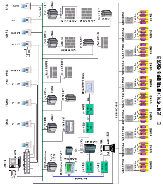 本項目的控製平台為美國羅克韋爾自動化公司ALLEN-BRADLEY Logix5000,主體網絡CONTROLNET,設備網DEVICENET+Profibus+Modbus,分布式I/O FLEX 1794+Canbus。運行RSView32係統畫麵的PC機通過1784-PCIC(S)專用網卡連入CONTRETNET,單機運行版。係統配置圖如圖1所示。其中三台L1 HMI和一台EWS為運行RSView32係統的PC機。