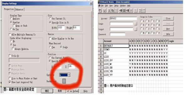 圖9和圖10分別為畫麵安全級別和用戶操作權限的設定窗口。