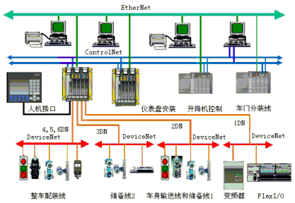 圖2為係統中所用的羅克韋爾自動化公司的可編程控製器PLC-5/80C的硬件配置(其自身有內置的遠程I/O(RIO)和ControlNet接口)。由於係統中控製的點數多、線路長,因此用了6個1771-SDN掃描器,共12條DeviceNet網絡與被控設備相連。12條DeviceNet網絡分別命名為1DN1、1DN2、2DN1、2DN2、3DN1、3DN2、4DN1、4DN2、5DN1、5DN2、6DN1、6DN2。其中,1DN1控製生產線上的所有14台變頻器;1DN2控製生產線上的所有FlexI/O節點,FlexI/O所連接的大部分設備是原總裝生產線上不能直接連接到DeviceNet網絡上的設備;2DN1控製車身輸送線(積放鏈);2DN2控製儲備線(積放鏈);3DN1和3DN2控製另一條儲備線(積放鏈);4DN1至6DN2控製整車裝配線(工藝鏈)。整車裝配線的工藝非常複雜,由153個工位組成,主要控製功能有工藝急停、與其它設備連鎖等;主要設備有底盤打號機、天窗裝配機械手、塗膠機械手、裝配機械手、風擋玻璃塗膠機器人、駕駛係統控製模塊、動力總成、檢測裝置等。係統共有200多個節點。